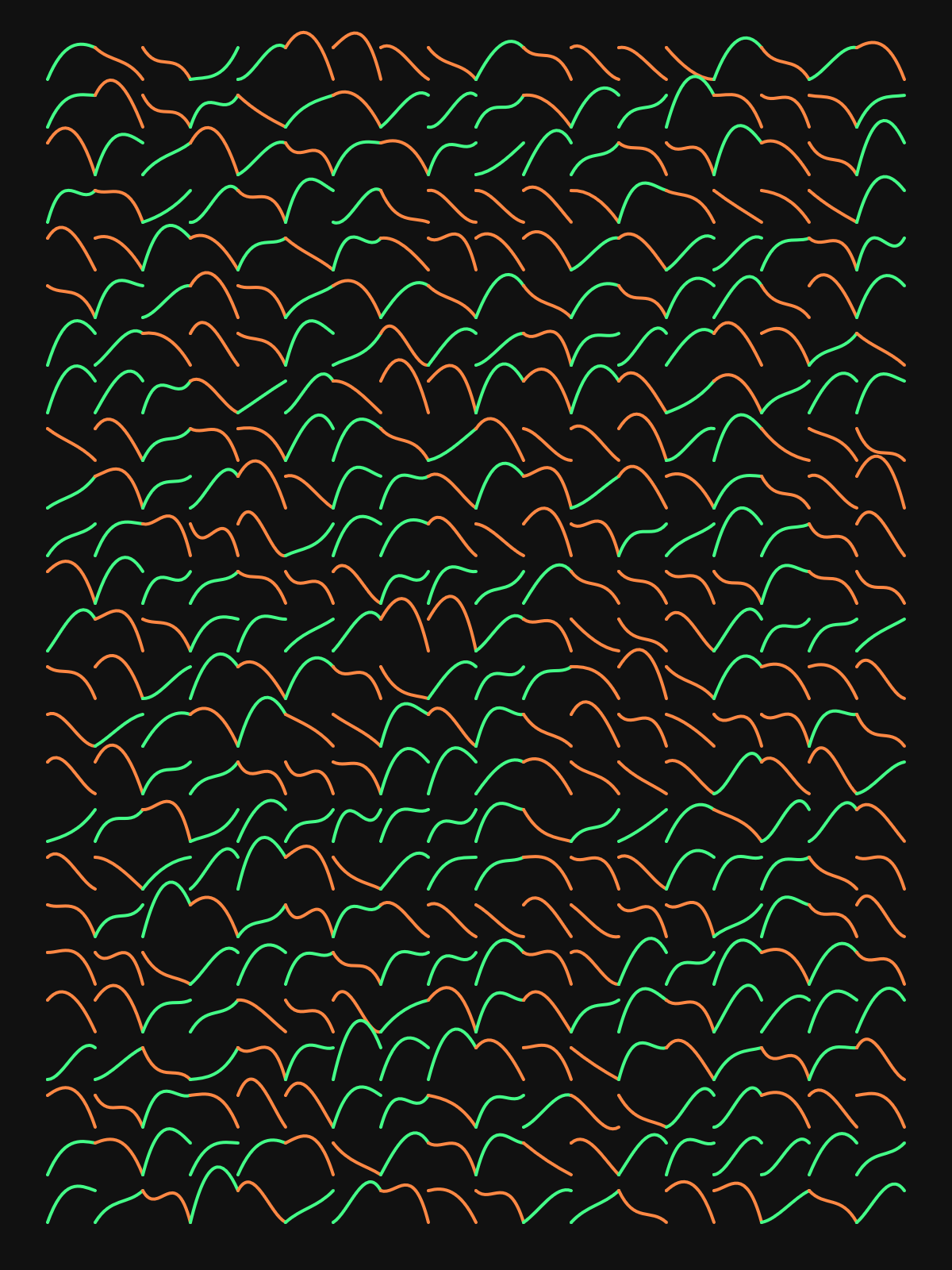 This page showcases a few creative coding artworks that I've made. I find that controlled randomness as a generative tool has the potential to create these emerging moments and interactions between the viewer and the artwork (i.e. happy accidents) while still staying within certain artistic guardrails that I set. The As such, every piece has something random to it - meaning that each of them also change every time you view them.